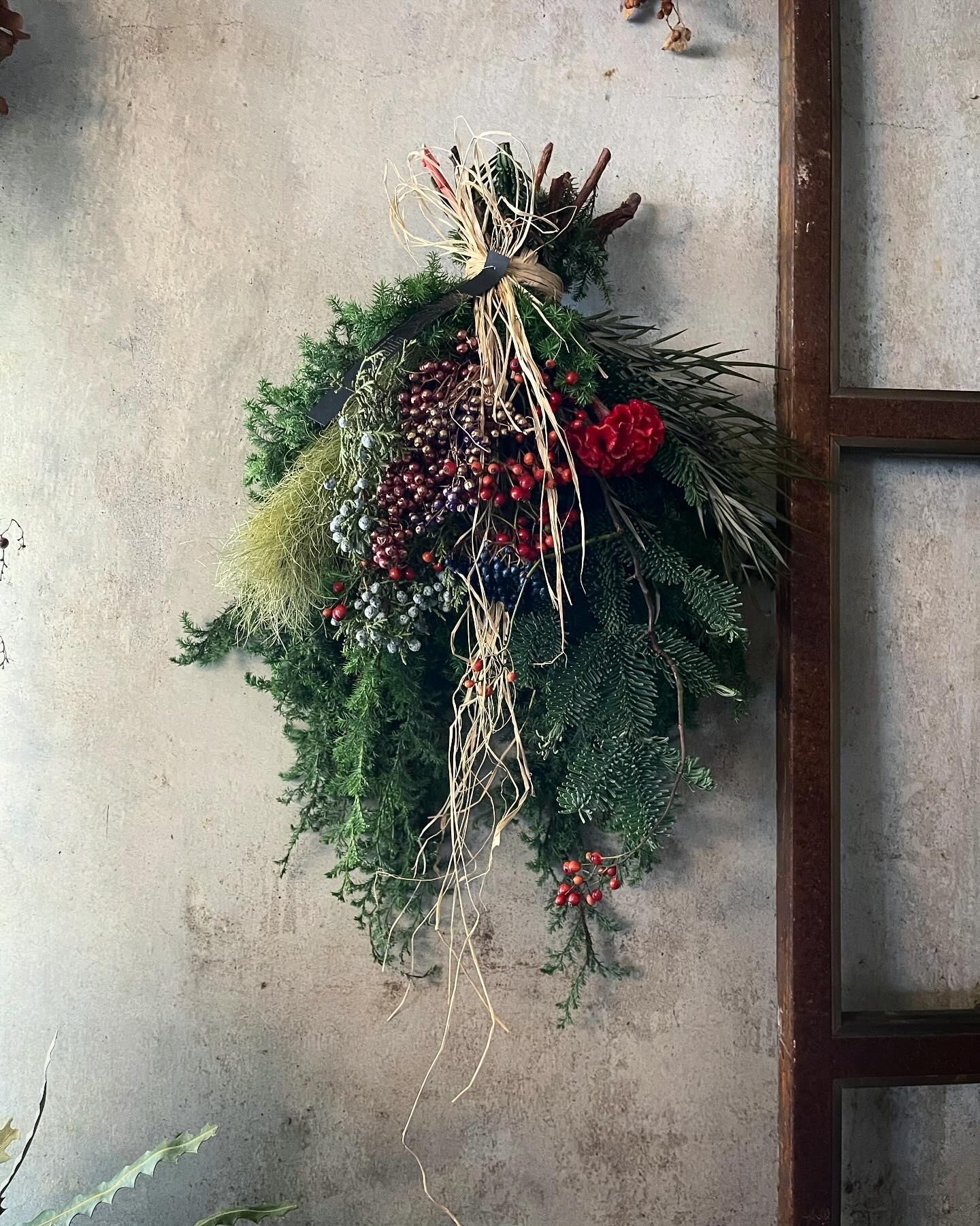 ローズヒップやビバーナムティヌスなどたくさんの自然の素材を使った手作りのスワッグで、お部屋や玄関をクリスマスムードに演出します♪