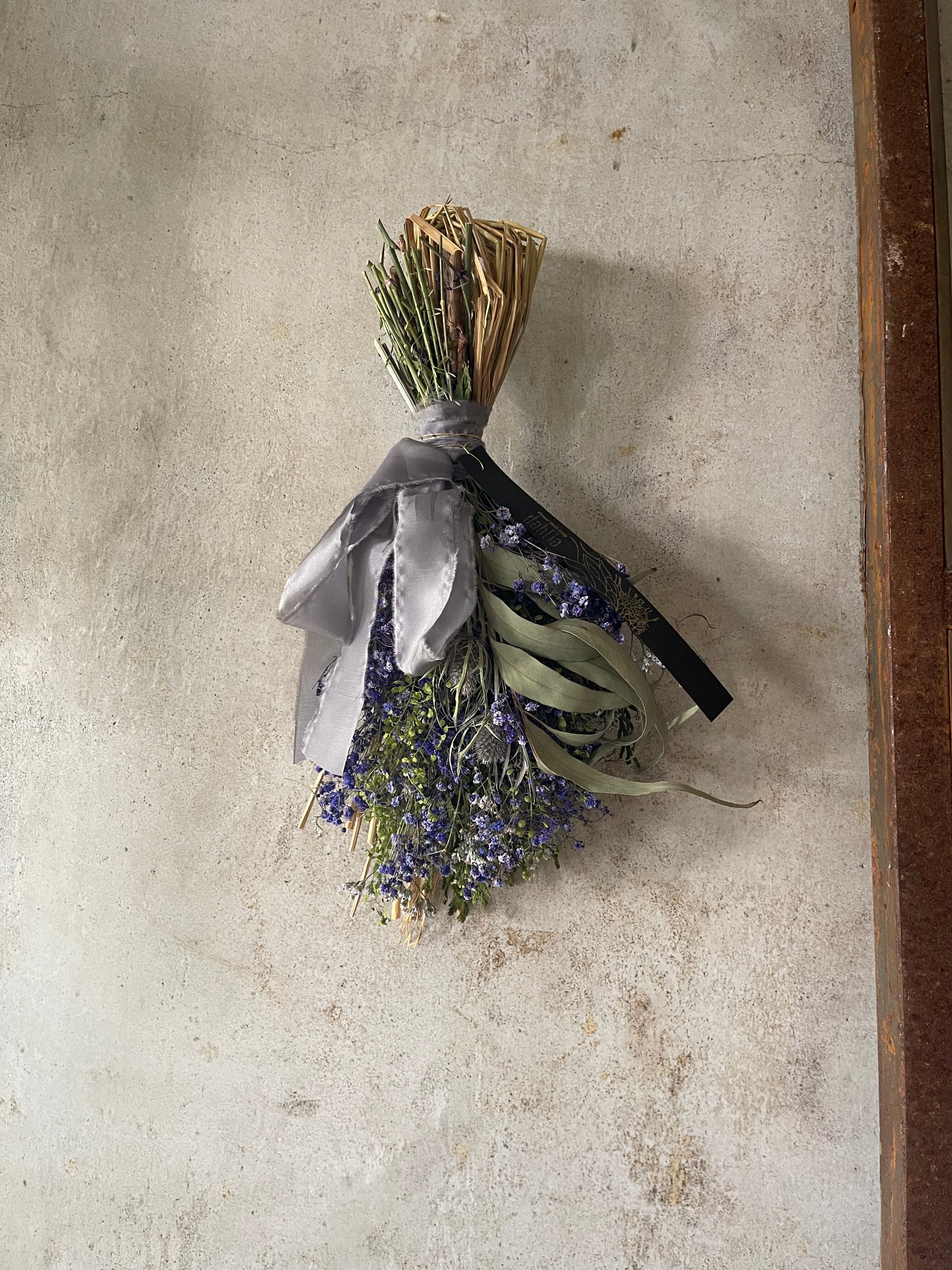 そんなパープルのカスミソウをメインにに、エリンジウム、スカビオサシード、ユーカリやタラスピ、ブルーファンタジア、などたくさんのお花たちをお入れしスワッグに致しました‼︎