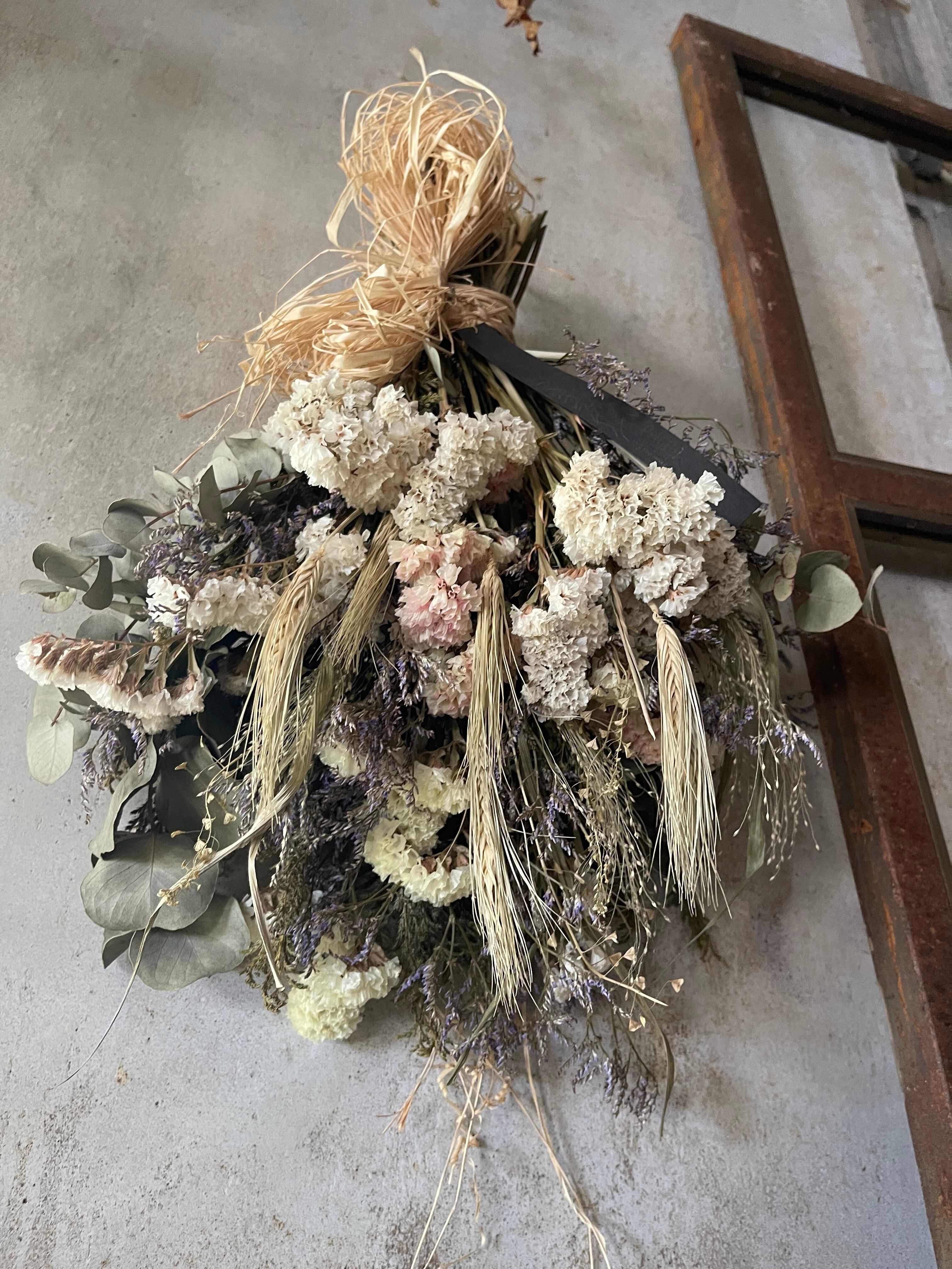 そんな3色のスターチスをメインに、ムギ、スモークグラス、ユーカリやタラスピ、ブルーファンタジア、などたくさんのお花たちをお入れしアンティーク感のあるスワッグをお作りしました‼︎