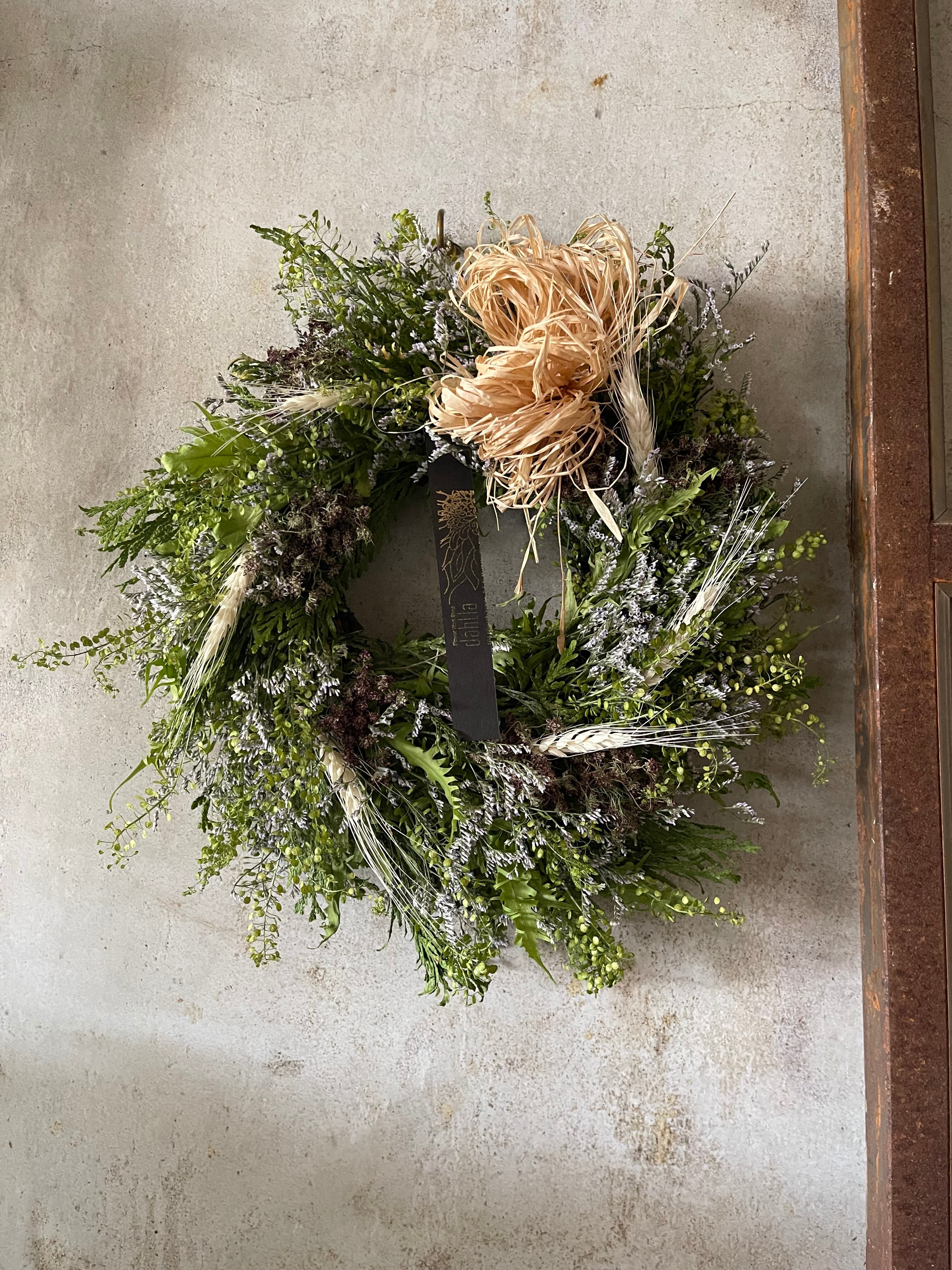 素材は、今、大人気のタラスピをはじめブルーファンタジアをメインにヒリュウシダ、ダウカスをお入れし、アクセントに白の小麦を配したとっても清涼感のあるリースです♪