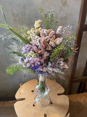 ガラスのフラワーベース付のドライブーケのご案内です♪