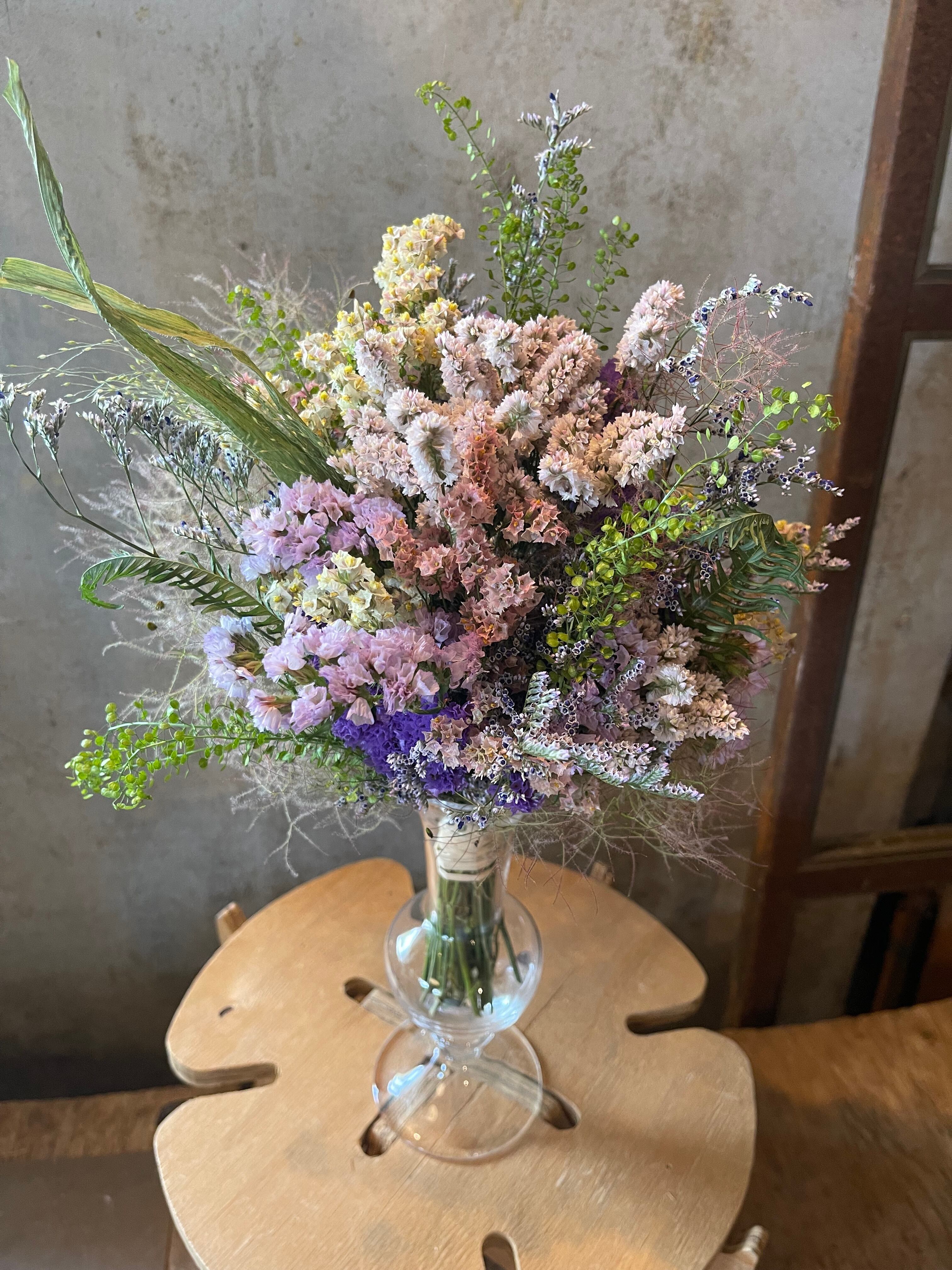 ドライブーケは、今、人気のニュアンスカラーの5色のスターチス、ミニスターチス、をメインにブルーファンタジア、スモークツリー、タラスピ、シースターなどたくさんの花材をふんだんお入れたとっても品の良いブーケになっております‼︎