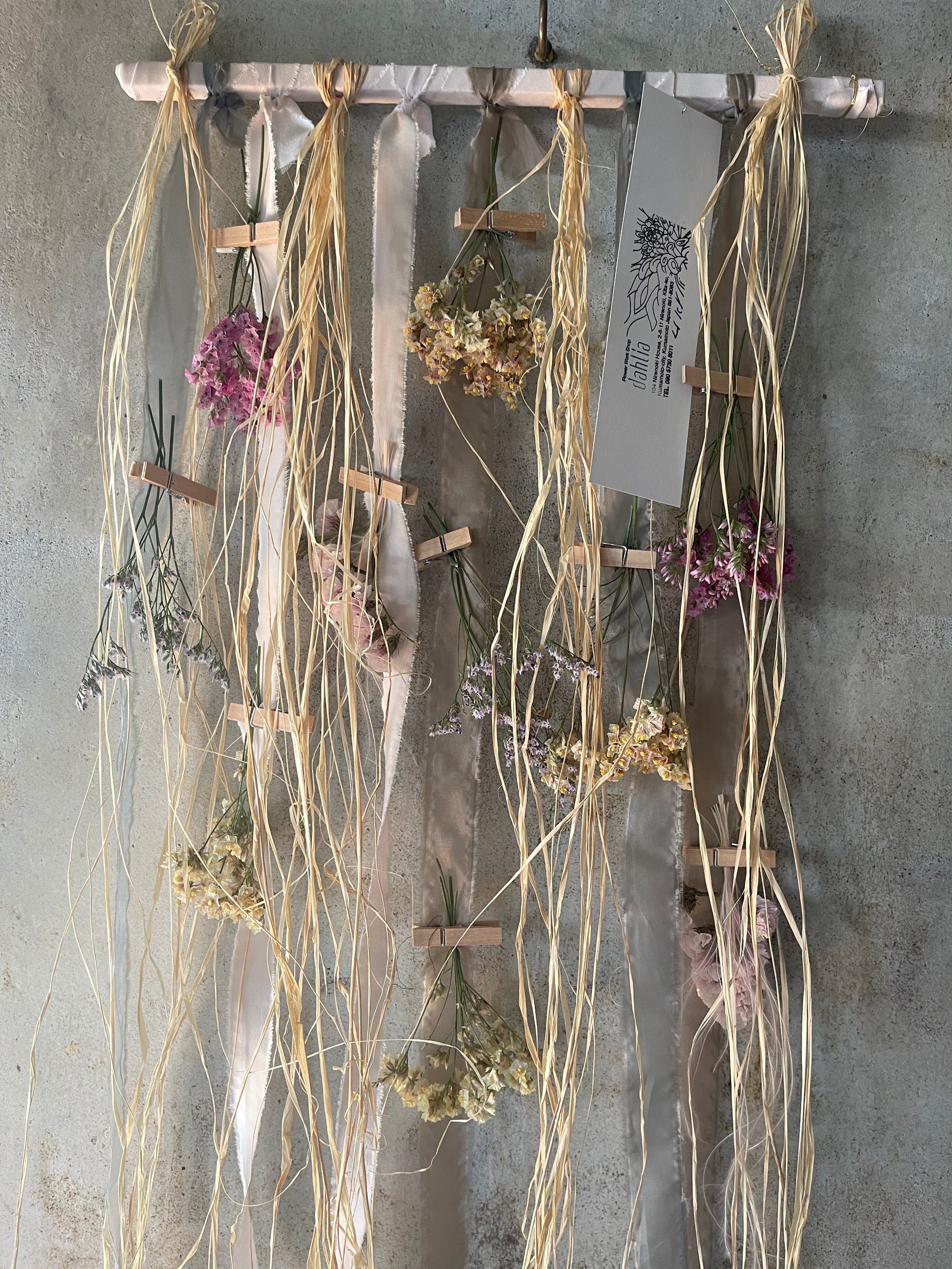 布をベースに、スターチスとミニスターチス、ラフィアなどをあしらった、透け感のある、とってもかわいい作品です♪