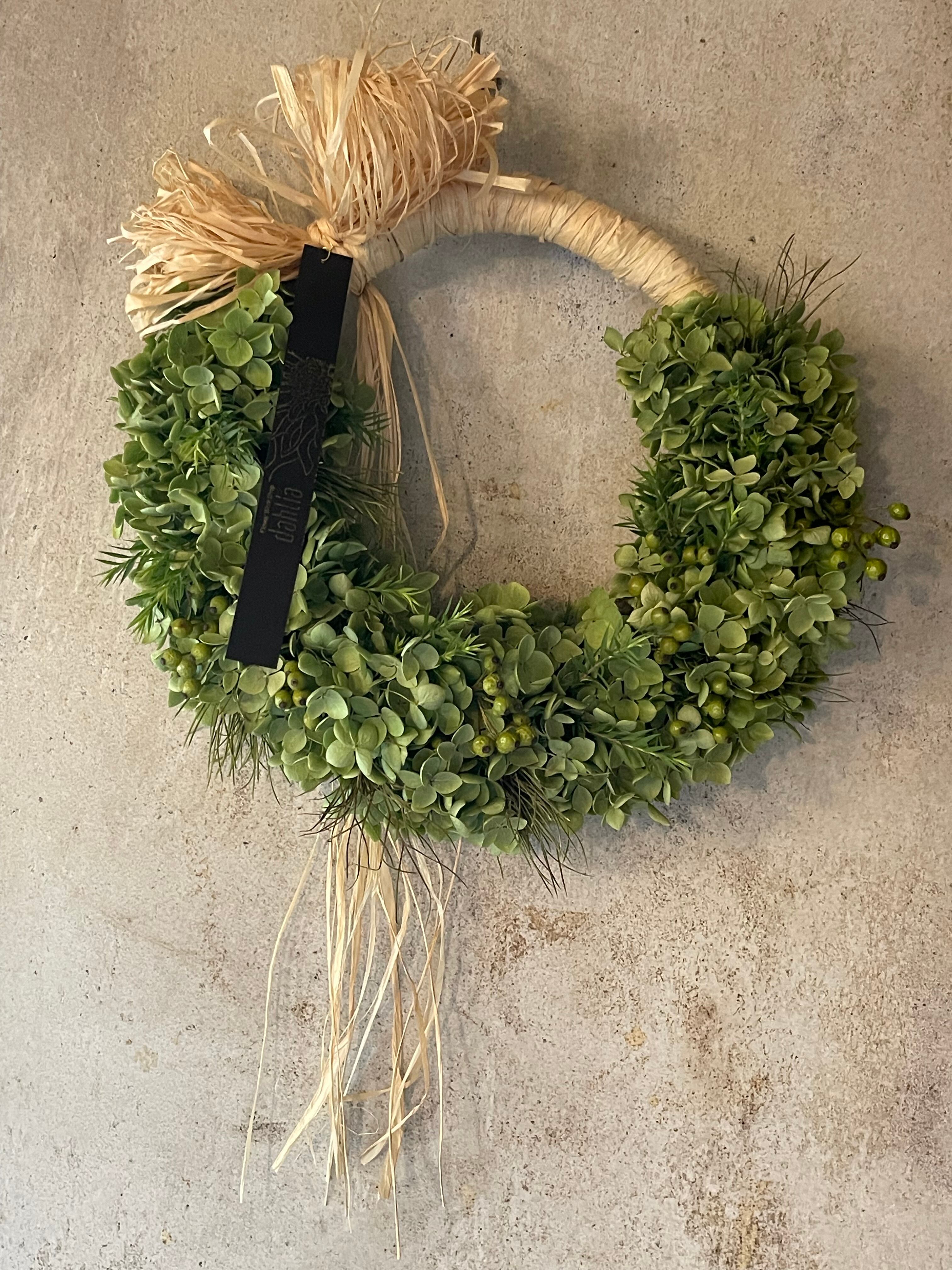素材は、ライムグリーンがとっても美しいアナベルあじさいをメインに、メラレウクブラックティーツリー、グレビレアボンコード、グリーンローズヒップ をお入れしとってもナチュラルで爽やかなリースです♪